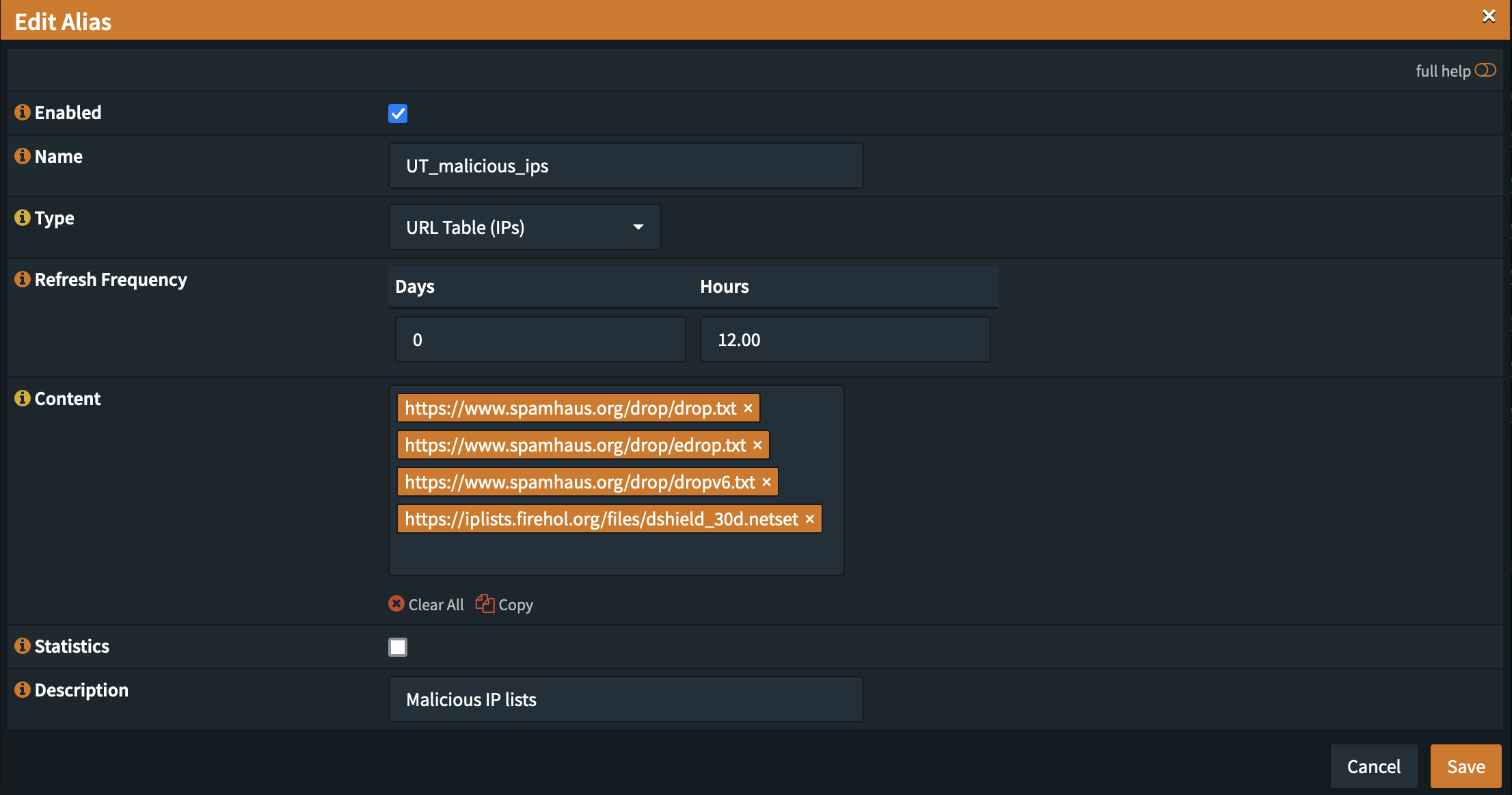 OPNsense 支持在别名中使用外部黑名单,别名可用在防火墙规则上。我们首先要使用“URL 表 (IP)”类型为所需的黑名单创建别名。