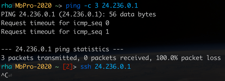 可以看到ping或ssh-ing IP都无法连通,在防火墙实时日志中也能看到流量被阻止。