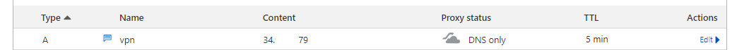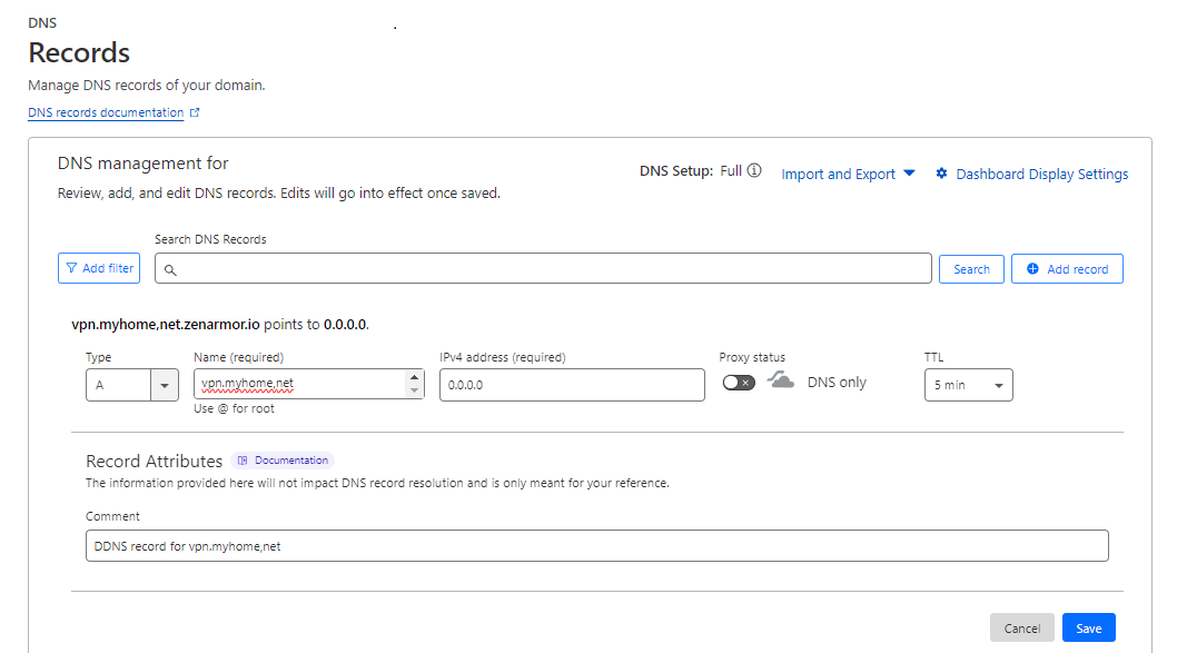 - 为您的域添加A.DNS 条目,例如vpn.myhome.net。使用以下设置:IP 设置为0.0.0.0、禁用代理和,TTL设置为5 分钟。