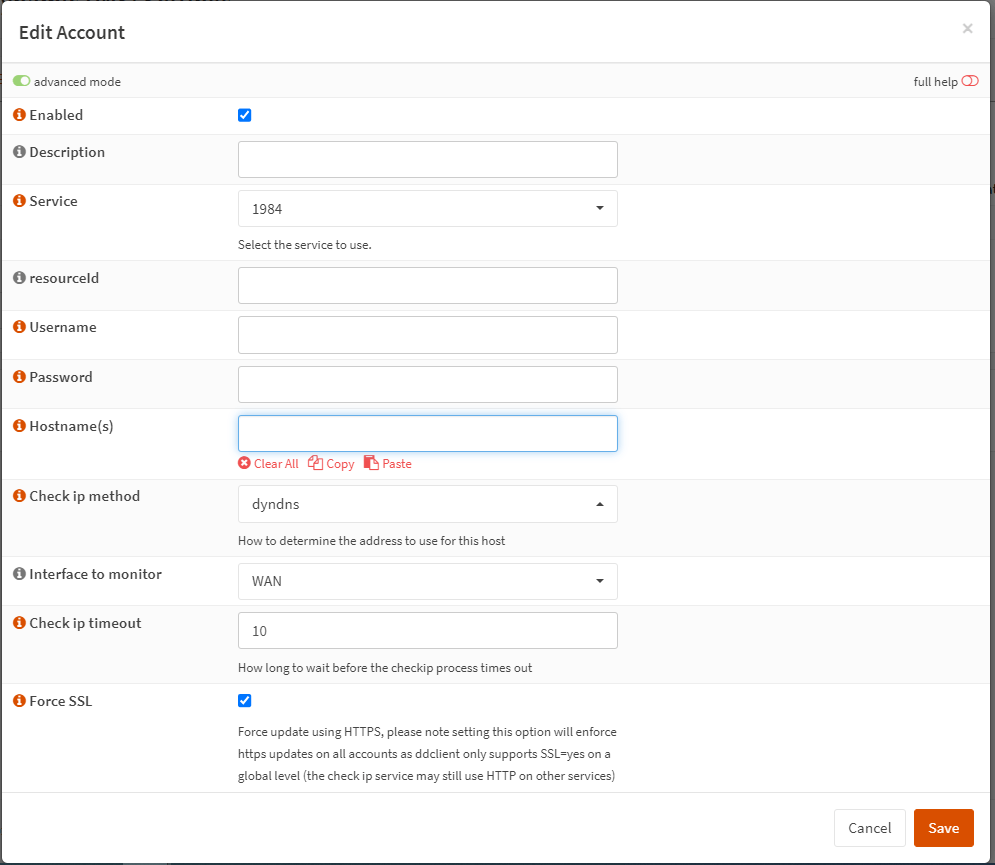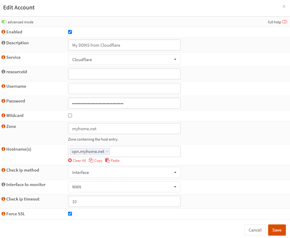 - 可以根据动态 DNS 提供商选择强制 SSL选项。如果您的提供商使用 HTTP,则必须禁用此选项。