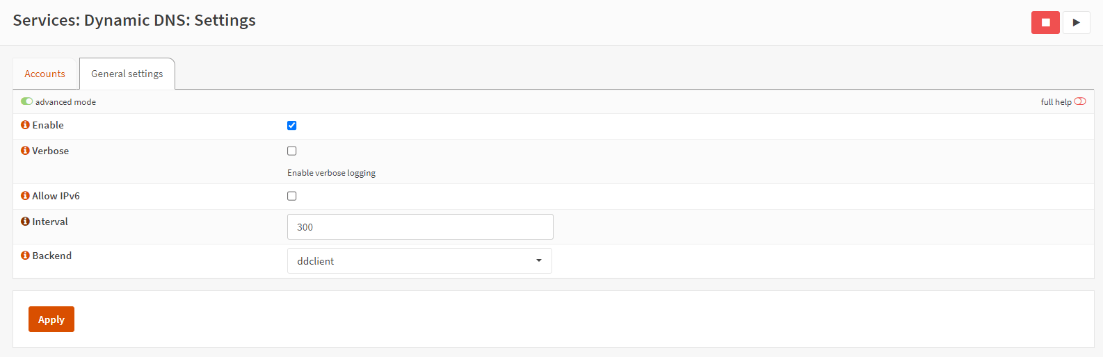 选择“常规设置”选项卡可以访问防火墙上已配置的所有动态 DNS 服务的默认配置。点击高级模式切换栏来查看高级设置。确保选中“启用”选项,根据需要启用详细日志记录选项,或者将其保持未选中状态。将间隔选项设置为默认值 300 秒,这是查询地址更改的持续时间。将后端设置为ddclient。或者您可以选择此选项的“本机”设置以启用对自定义 HTTP 请求的支持。输入完成以后,单击“应用”以激活设置。