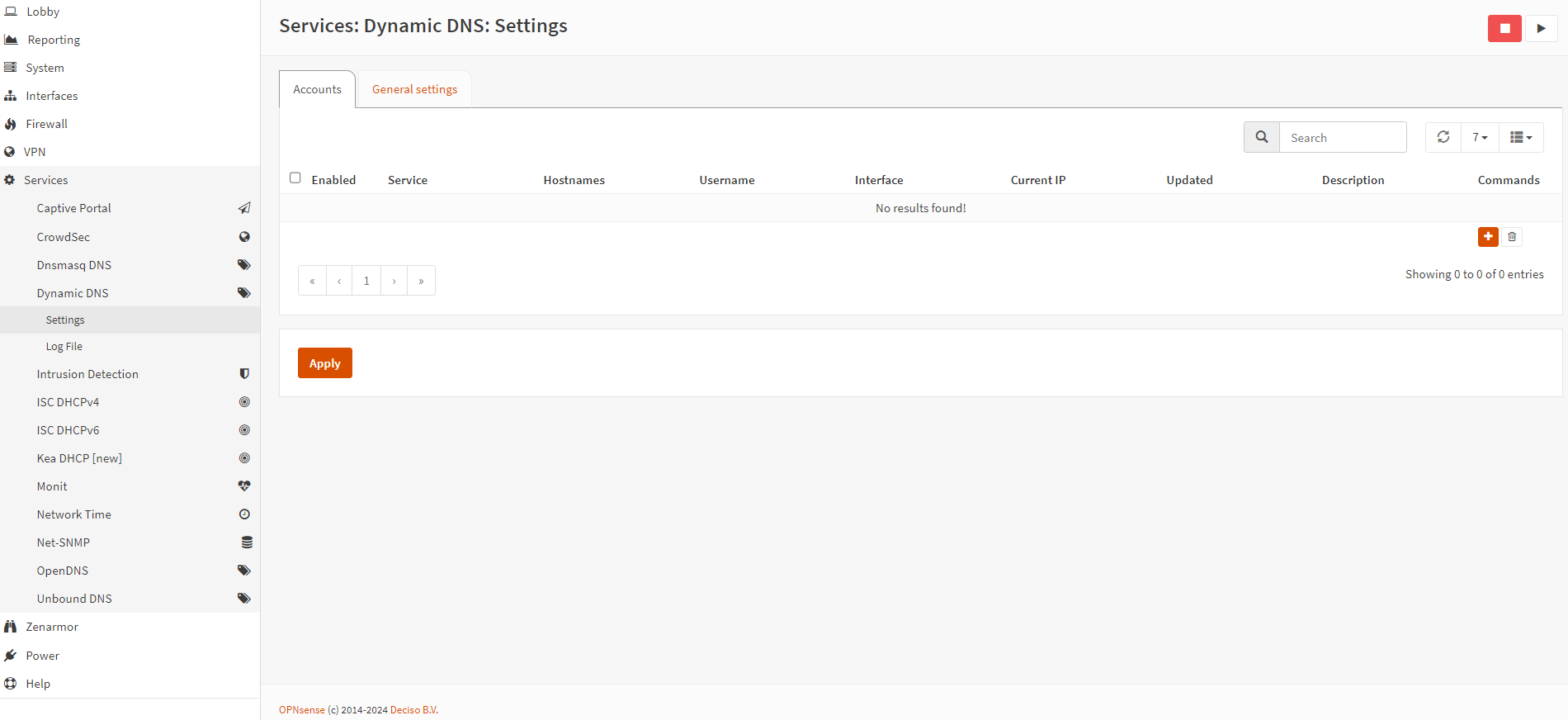 - 导航至OPNsense 防火墙上的服务→动态 DNS →设置。