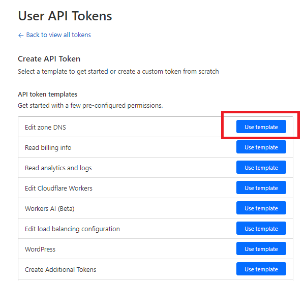 图 7. 在 Cloudflare 上查看 API 密钥 - 选择编辑区域 DNS选项旁边的使用模板。