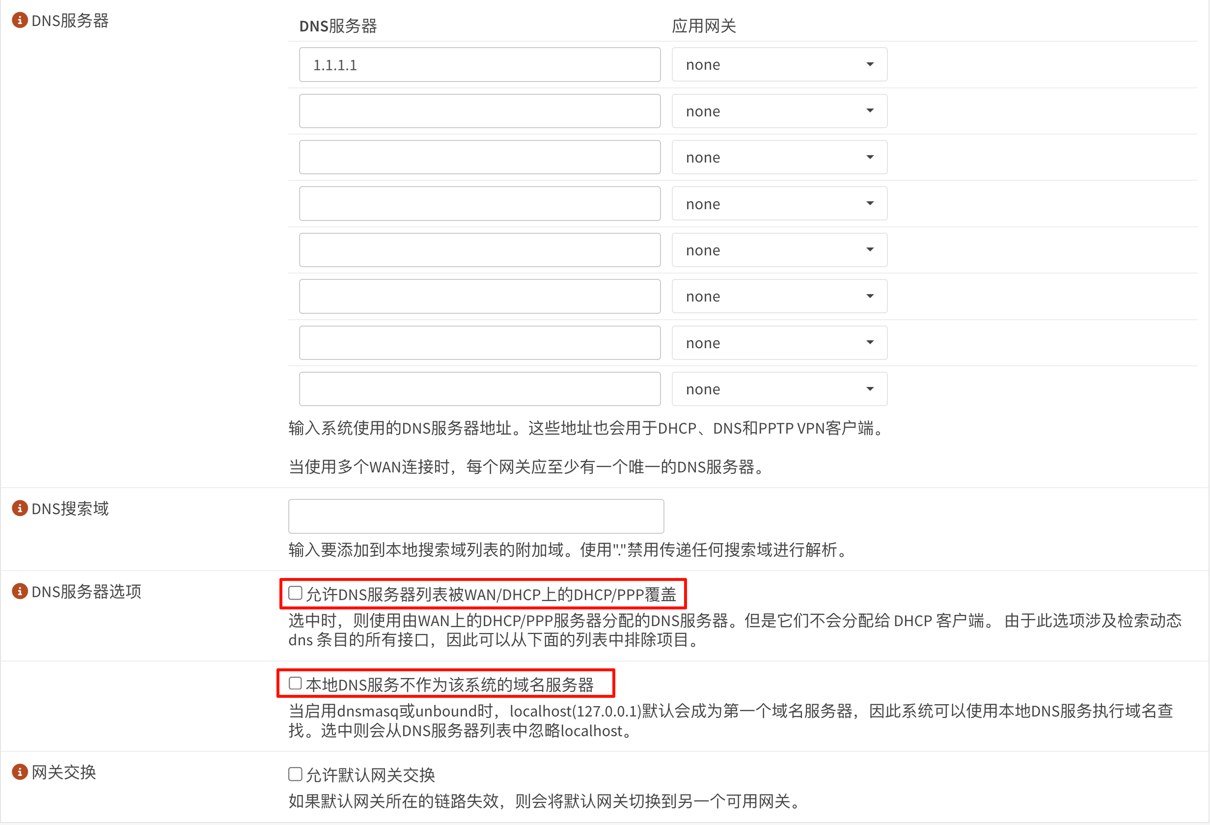 该选项改变了OPNsense、Unbound DNS和DHCP客户端执行的DNS查找的行为。启用该选项后,如果填写了DNS列表,它仍然使用DNS列表中列出的服务器。如果没有在列表中指定任何DNS服务器,它只会使用WAN接口提供的DNS服务器。