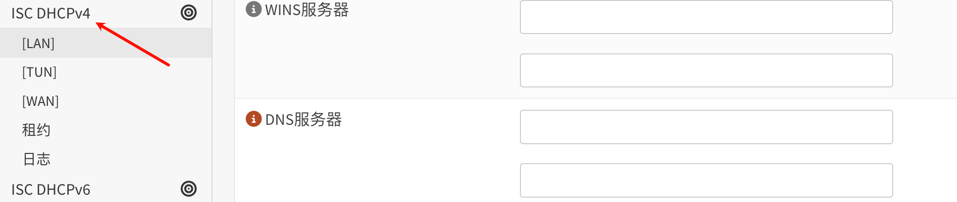 在ISC DHCPv4(或 DHCPv6)接口页面,可以为特定网络设置DNS服务器。如果希望为一个或多个本地网络使用不同的DNS服务器,可以在 DHCPv4(或 DHCPv6)接口页面指定。