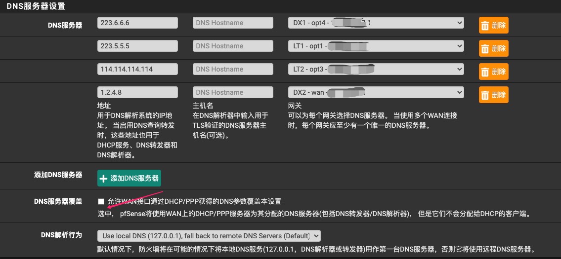 导航到”系统>常规设置”菜单,在DNS服务器设置选项,为每个WAN接口至少填写一个DNS服务地址。推荐使用速度较快的公共DNS,如果你配置了Pi-hole,也可以在这里填入Pi-hole的服务器地址。PPPOE拨号用户,DNS服务器覆盖选项不要勾选,其他选项默认即可。