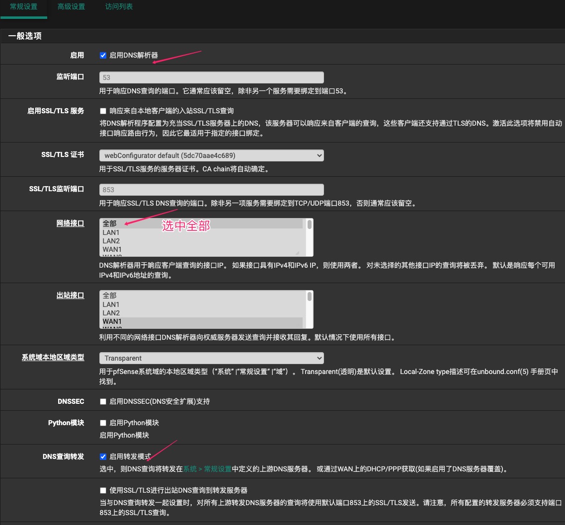 导航到”服务>DNS解析”菜单,选中启用DNS解析器和启用转发模式两个选项,注意网络接口选中全部,其他选项默认。