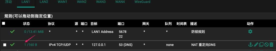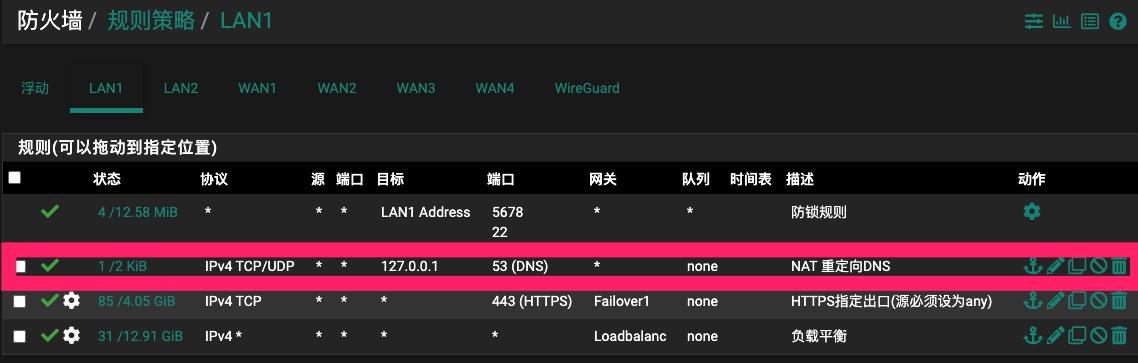 保存并应用更改后,防火墙的LAN1接口将自动添加对应的防火墙规则,将该防火墙规则移动到列表顶部保存并应用更改,如下图所示。