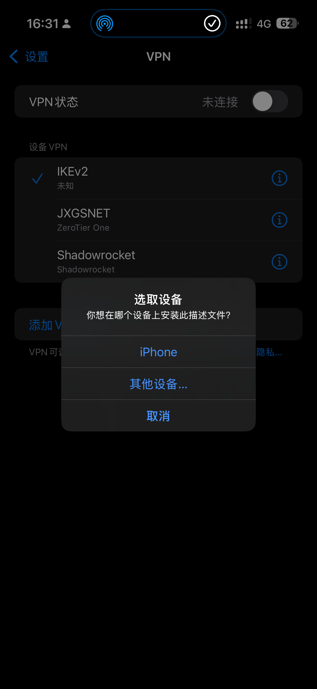 返回设置>VPN,然后选中刚才的配置文件,打开VPN 切换开关进行连接。