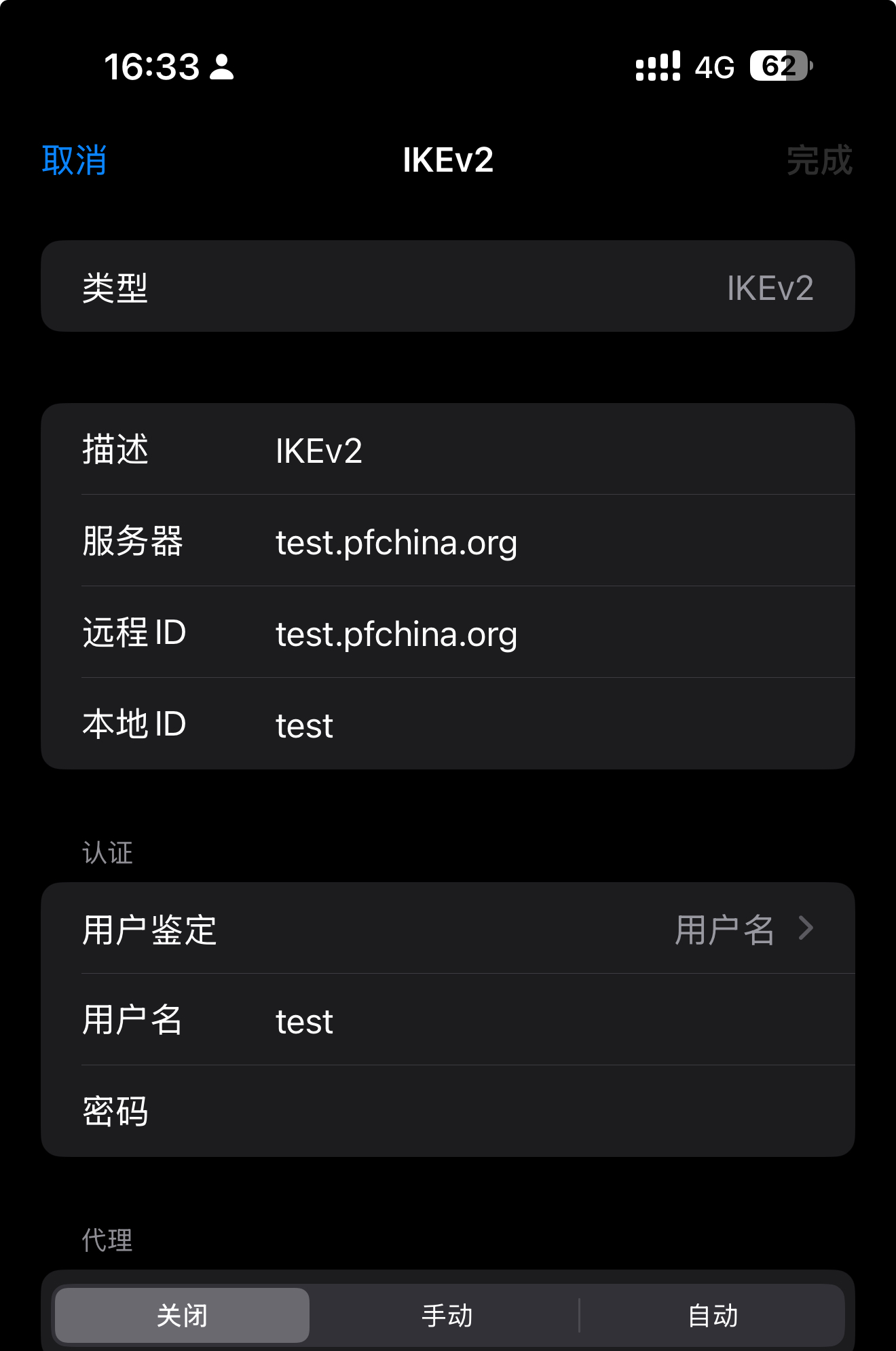 类型选IKEv2,服务器选项填入OPNsesne域名或公网地址,远程 ID输入在IPsec本地认证部分设置的ID,本地ID可以留空,用户名和密码填入在IPsce预共享密钥中设置的值,点击右上角完成按钮完成配置。