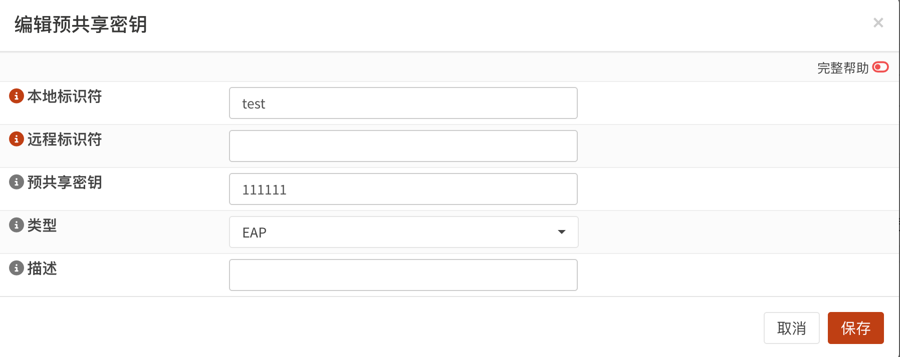 注意,本地标识符是用户名,预共享密钥是 VPN 连接的密码,类型选EAP。如果有多个 VPN 服务器,使用FQDN可以轻松掌握用户被分配到哪一个服务器。