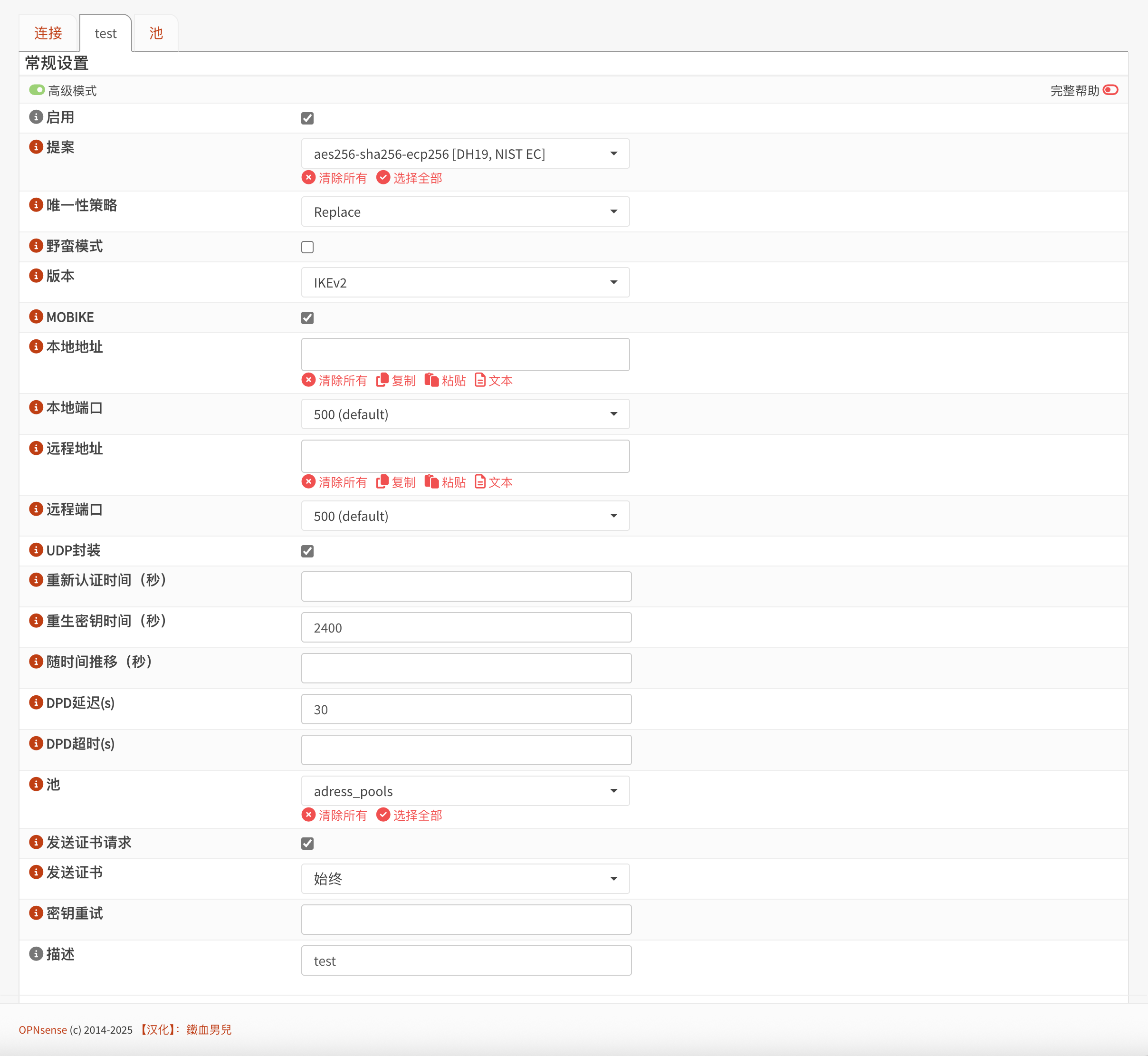 选中启用选项,提案选aes256-sha256-ecp256(iphone的IKEv2使用该提案),唯一性策略选Replace,版本选IKEv2,选中MOBIKE,本地端口使用默认值,选中UDP封装,池选中前面创建的地址池,发送证书必须选中始终。