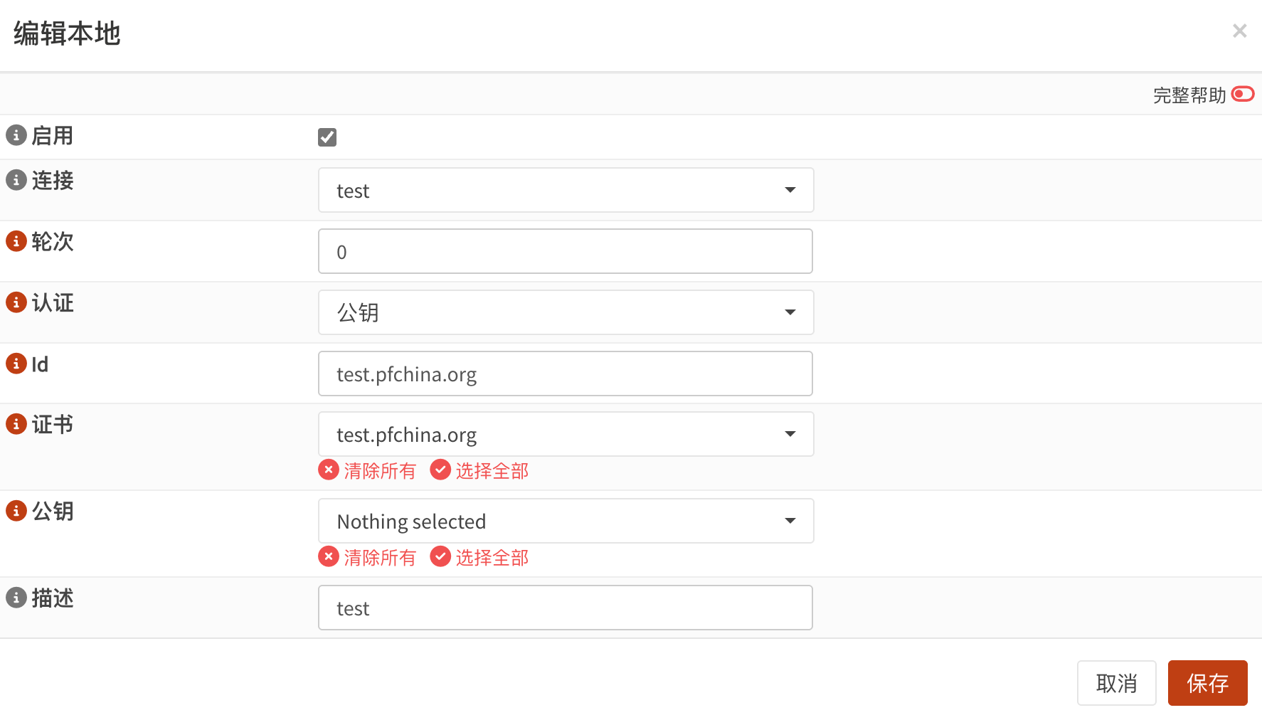 选中启用选项,选中前面创建的连接test,认证选公钥,输入ID和前面创建的服务器证书,公钥不选。输入完成点击保存。