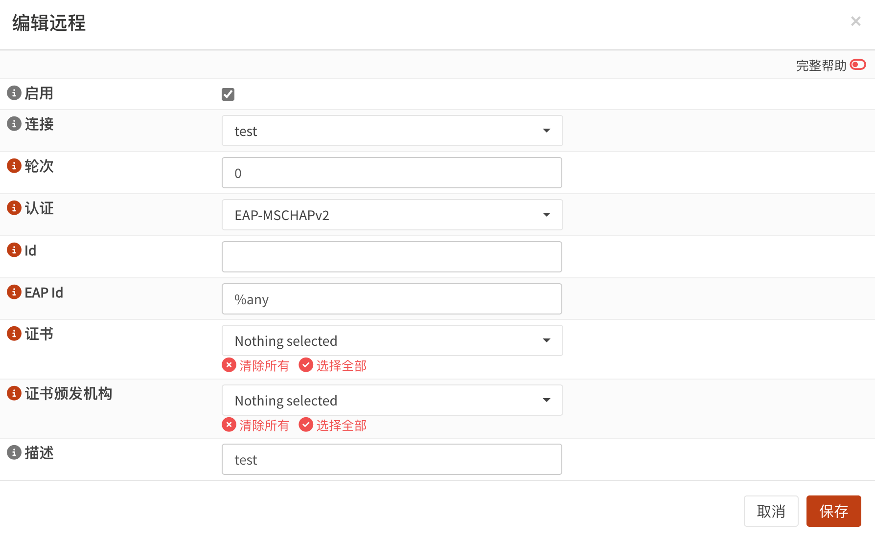选中启用选项,选中前面创建的连接test,认证方式选中EAP-MSCHAPv2,Id留空,EAP Id输入%any,输入描述说明,点击保存。