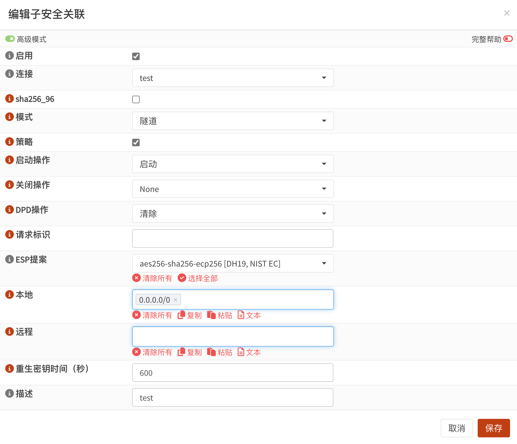 选中启用选项,选中前面创建的连接test,模式选隧道,选中策略,ESP提案与前面的连接设置一致,允许访问的本地地址范围输入0.0.0.0/0(建议只输入本地允许访问的网络范围),重生密钥时间600(如果是Windows客户端应设为0),保存并应用配置。