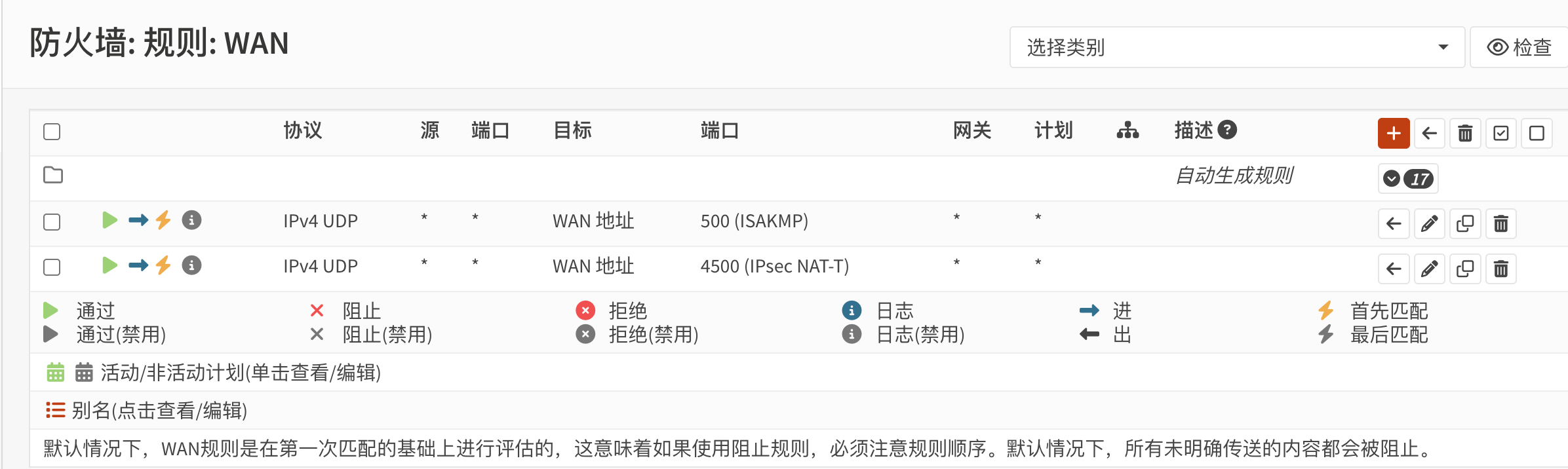 转到防火墙>规则>wan接口,添加允许IPsec访问的规则,接口放行UDP 500和4500端口。