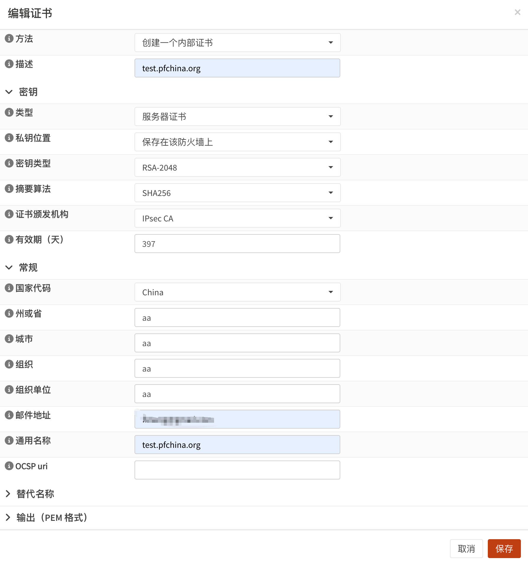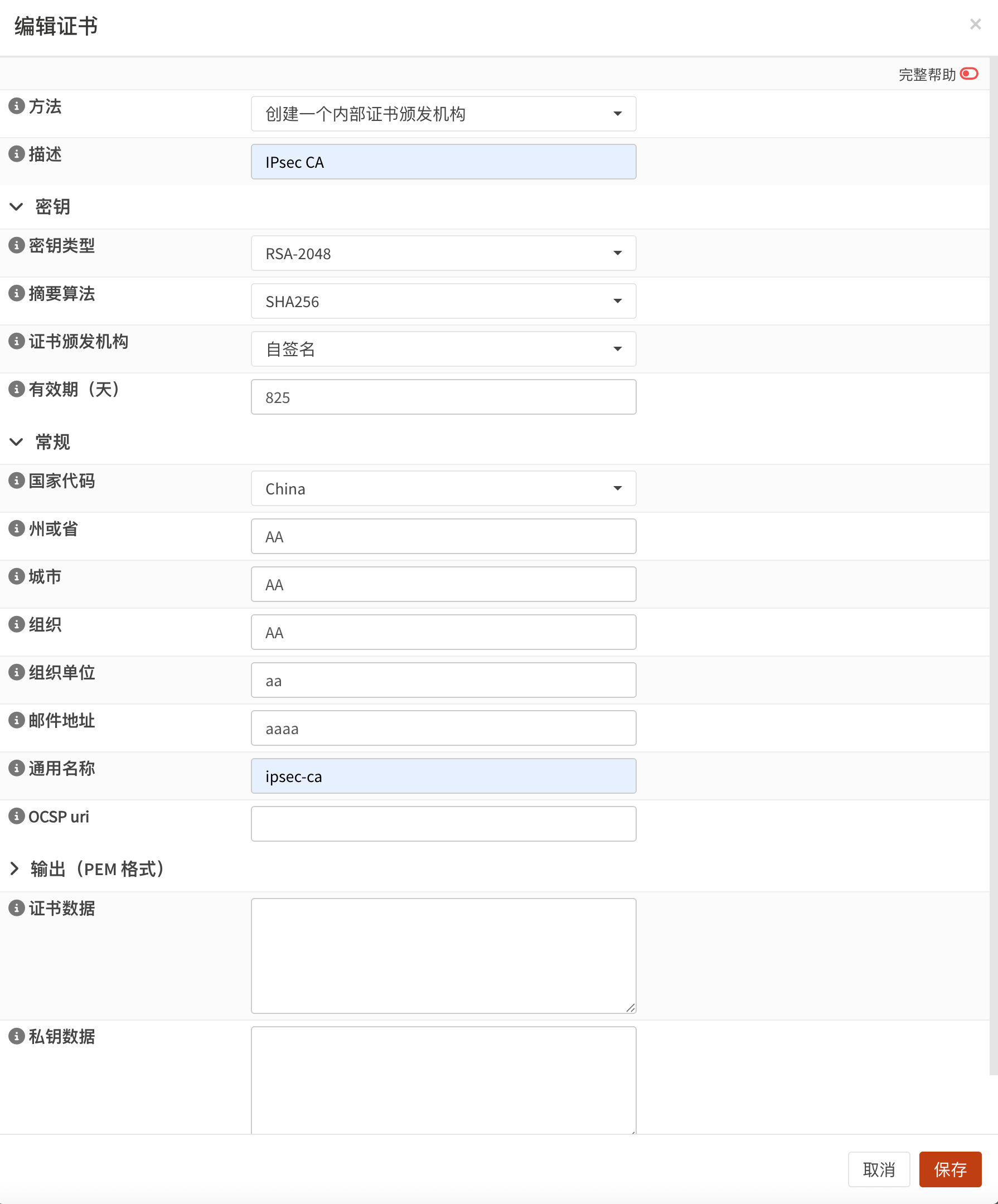 转到系统>证书>颁发,新建一个自签名CA,内容如下: