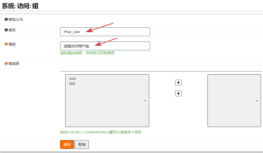 添加一个VPN组,并赋予组访问IPsec VPN的权限。