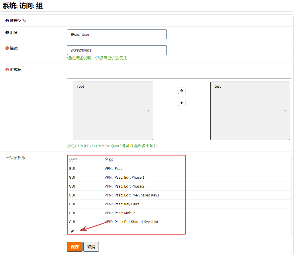 保存后,在新添加的组列表右则,点击编辑图标,给组赋予访问IPsec 所有设置的权限。