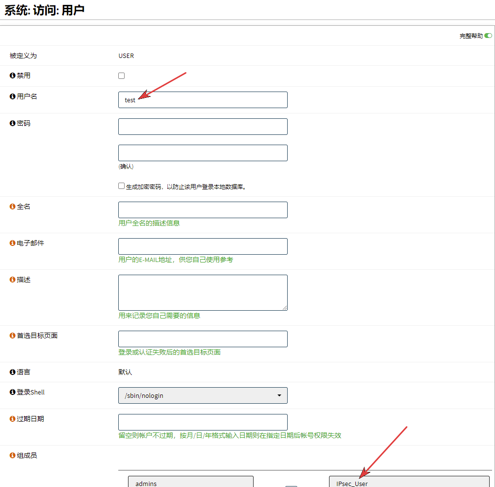 然后导航到系统>访问>用户菜单,添加一个远程访问用户。并将该用户添加至刚才新建的IPSEC_User组中。