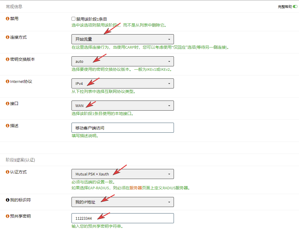 保存移动客户端配置后,会提示创建阶段1配置。阶段1参数如下:
