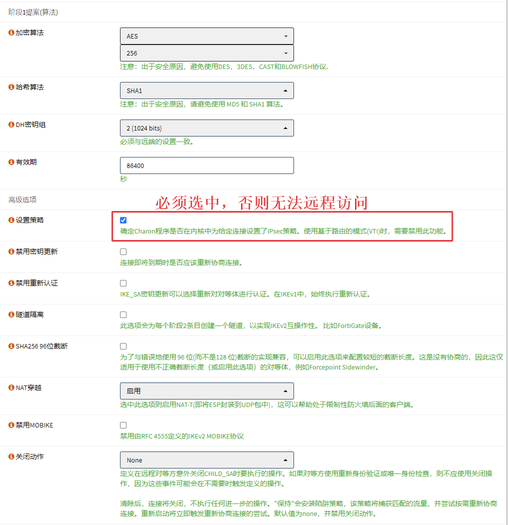 - 设置策略:必须选中。解决在VPN成功连接后,不能远程访问的问题。