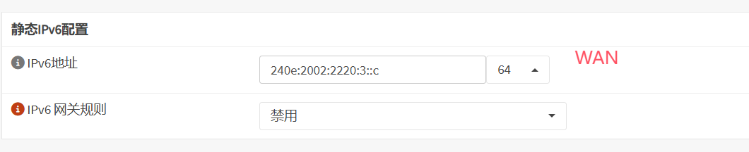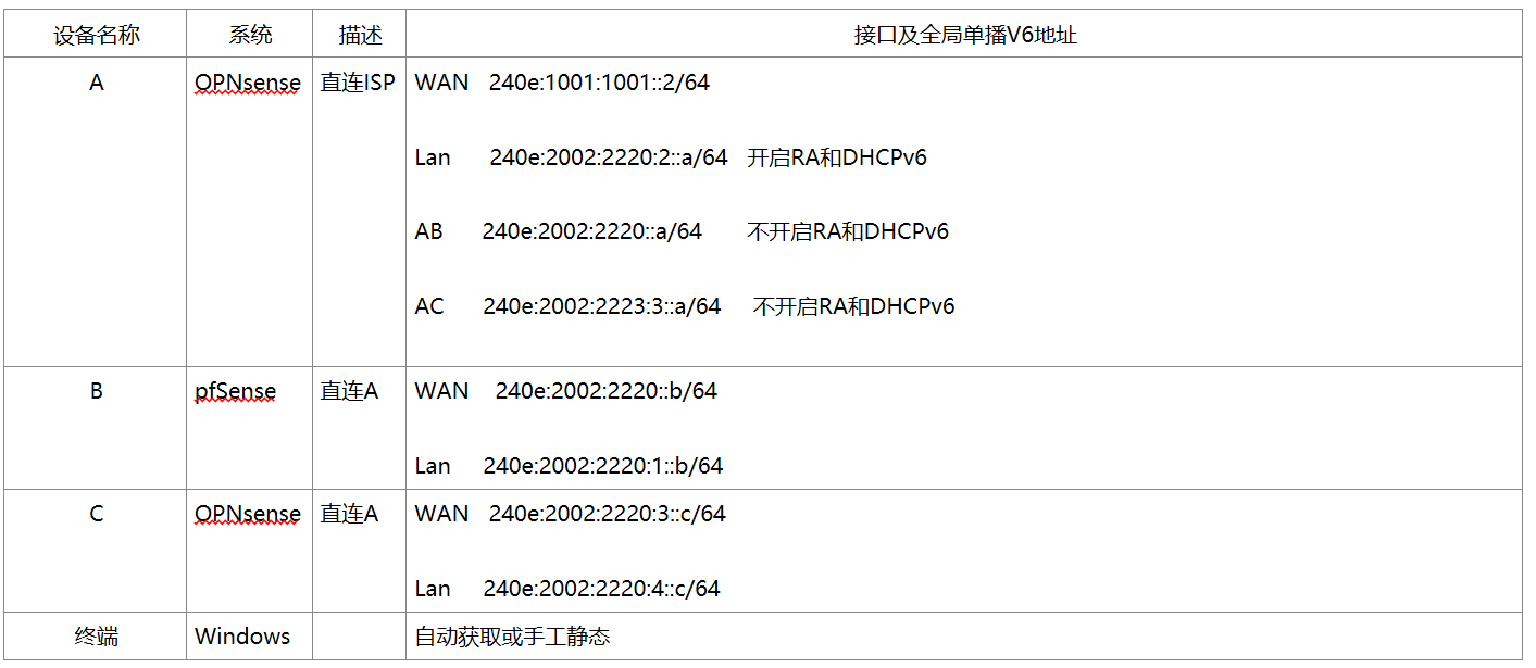 - A-C 启用OSPFv3,注意:C添加v6默认网关后,不能在WAN再指定网关。如果指定,OSPFv3邻居可能无法建立(原因未知),C 直接通过A通告的缺省路由访问互联网。