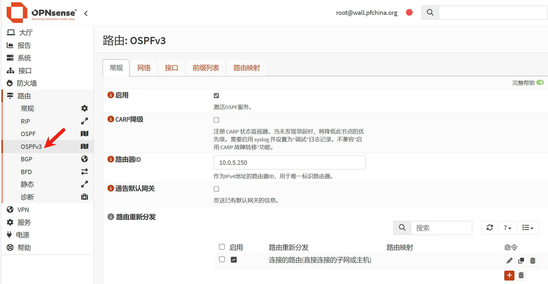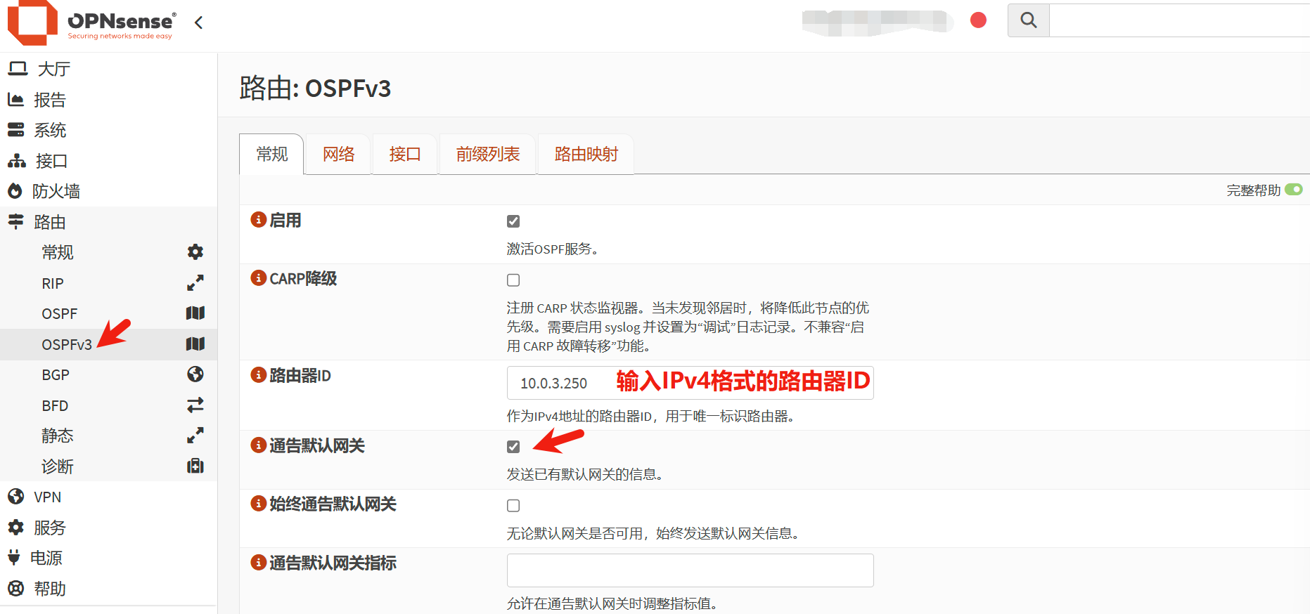 在OPNsense A上,转到路由>OSPFv3,配置OSPFv3。选中启用,输入路由器ID,并选中通告默认网关。