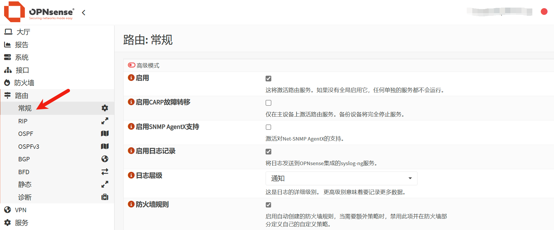转到路由>常规,选中启用FRR路由功能,并启用日志记录和防火墙规则。