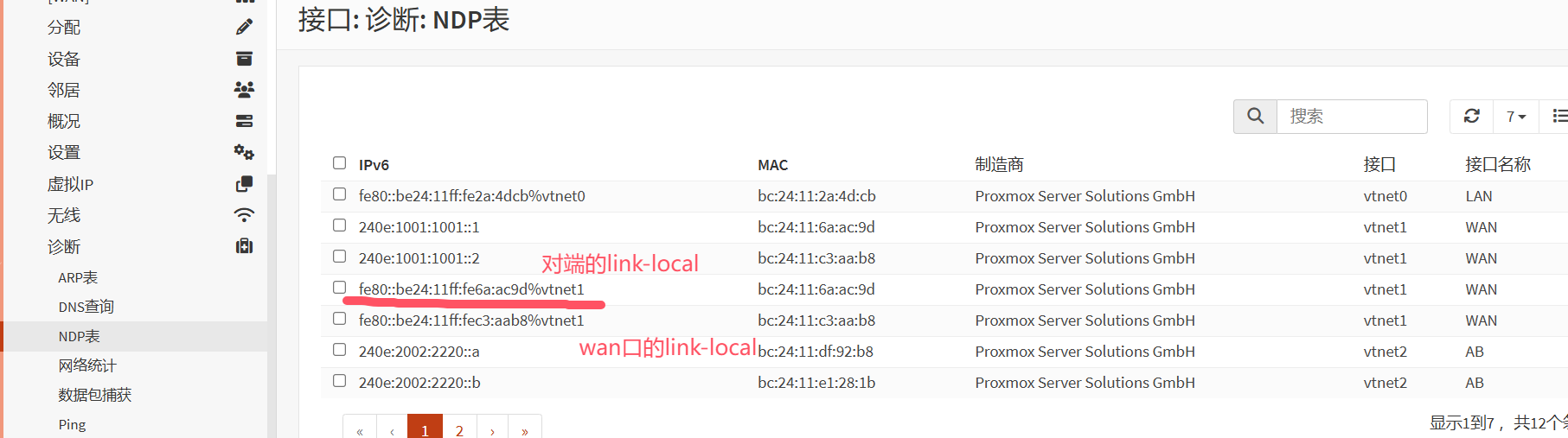 可以判定该ISP接口的全局单播v6地址为204e:1001:1001:1。因v6网关地址通常使用本地链路地址(v6地址可能经常修改,而Link-local地址通常自动生成不会经常修改),因此还需要确定网关的Link-Local地址。ping通后,通过接口-诊断-NDP表查看邻居的link-local地址为 fe80::be24:11ff:fe6a:ac9d。