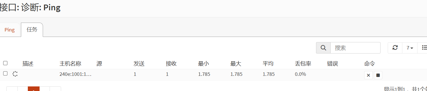 本示例中,ISP未提供v6网关地址(中国移动提供的静态IPv6地址可能会存在这种情况)。将WAN地址配置为SLACC或者DHCPv6均未能获取到v6地址。因此可以确定运营商接口未开启DHCPv6和IPv6的RA服务。猜测其网段地址为v6地址的首个或者最后一个。在A的WAN接口配置ipv6地址后,使用OPNsense自带的ping工具,在未配置网关地址的情况下,顺利ping通了204e:1001:1001:1。