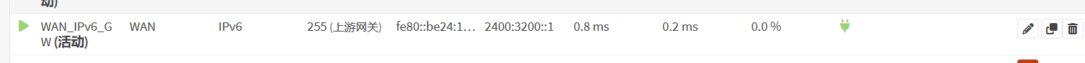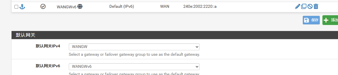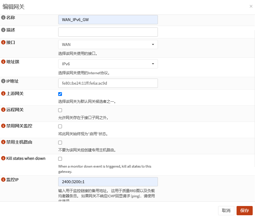 为OPNsense A 配置v6缺省网关。转到系统>网关>配置,为WAN接口配置一个v6网关,网关地址输入前面查找的Link-Local地址,并选中上游网关选项。