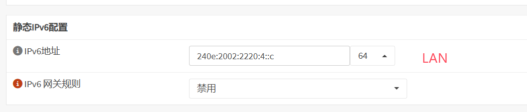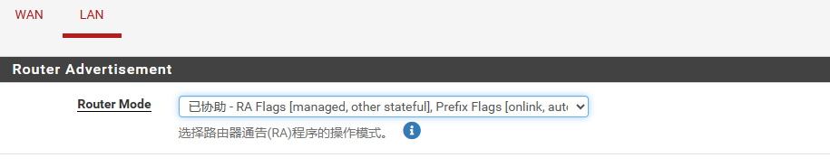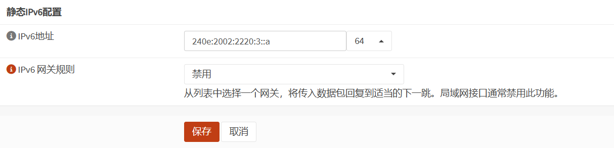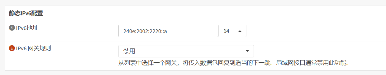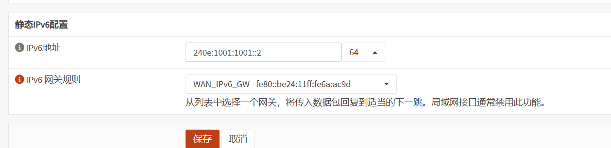 先在OPNsense A 给LAN接口配置一个v6地址。转到接口>LAN,为接口配置一个V6地址。