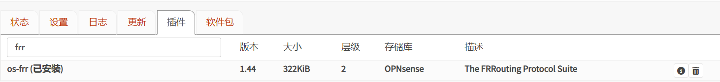 转到系统>固件,插件选项卡,搜索 frr 插件并安装。