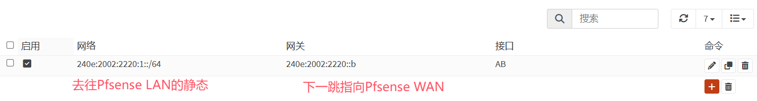 转到路由>静态,路由选项卡,添加去往pfSense LAN侧的静态v6路由。