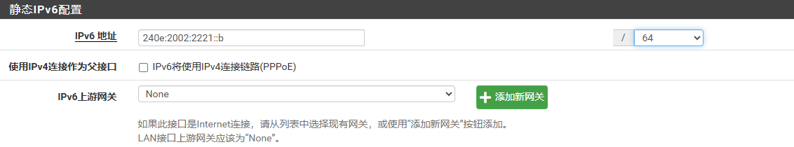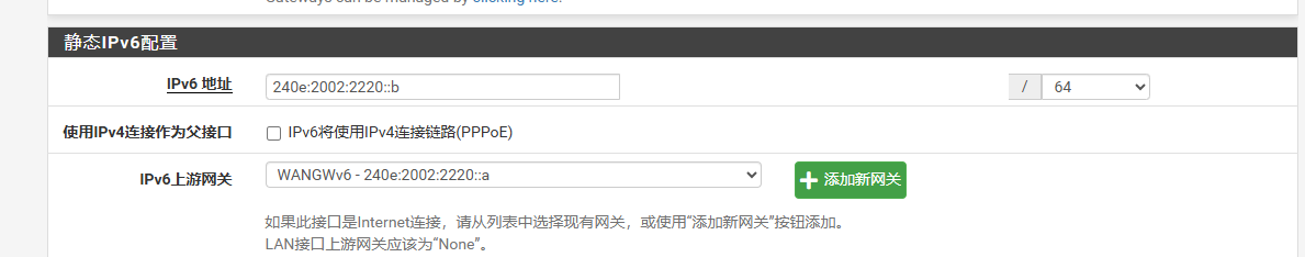 配置pfSense B上WAN接口v6地址和网关 此处网关可使用Opnsense A AB接口的全局单播地址,也可使用AB接口的链路本地地址。