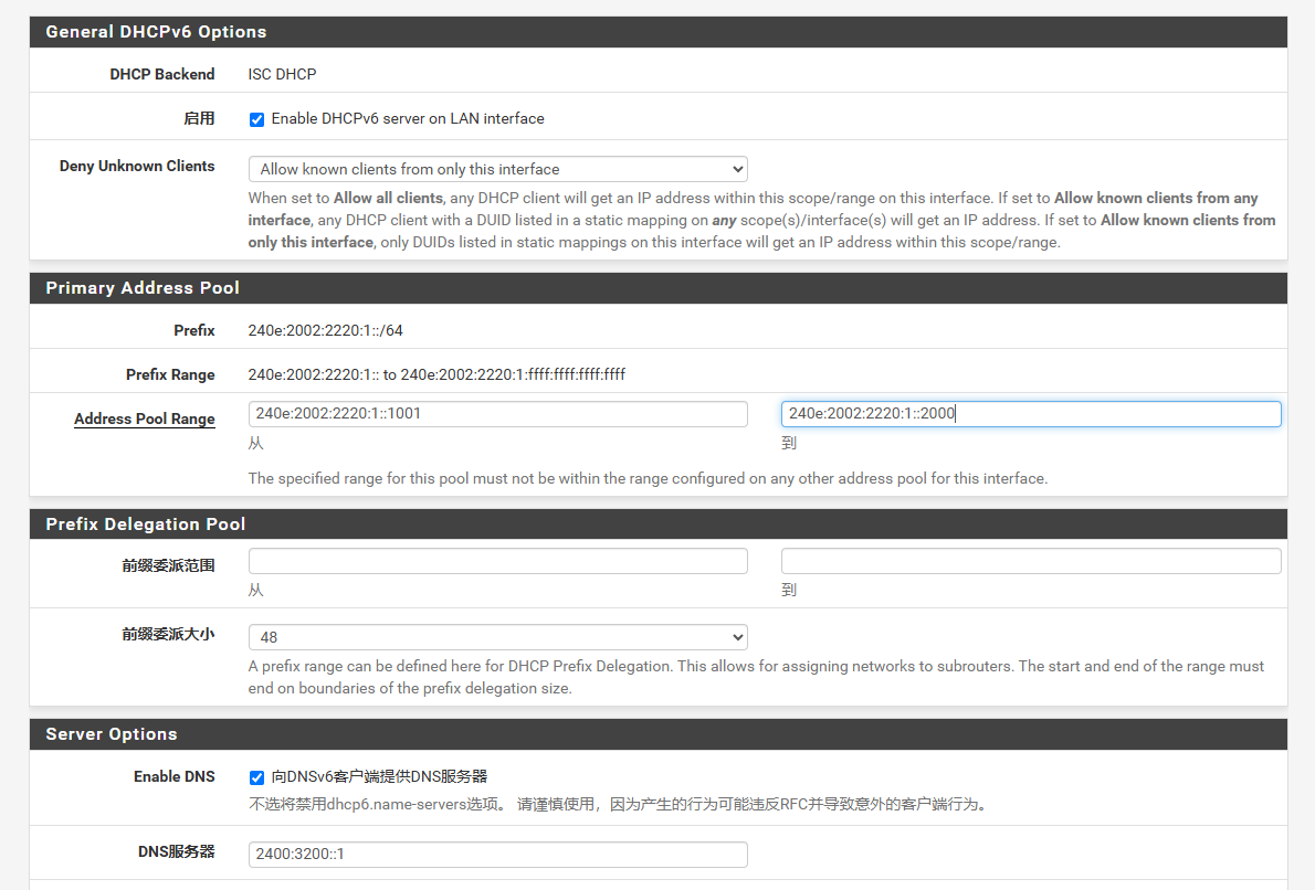 检查OPNsesne C 后面的客户端,查看否获取到240e:2002:2220:4::/64 的v6地址。