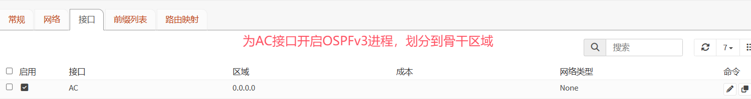 转到路由>OSPFv3,接口选项卡,为AC开启OSPFv3进程,并划分到骨干区域。