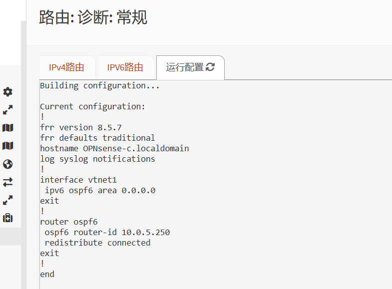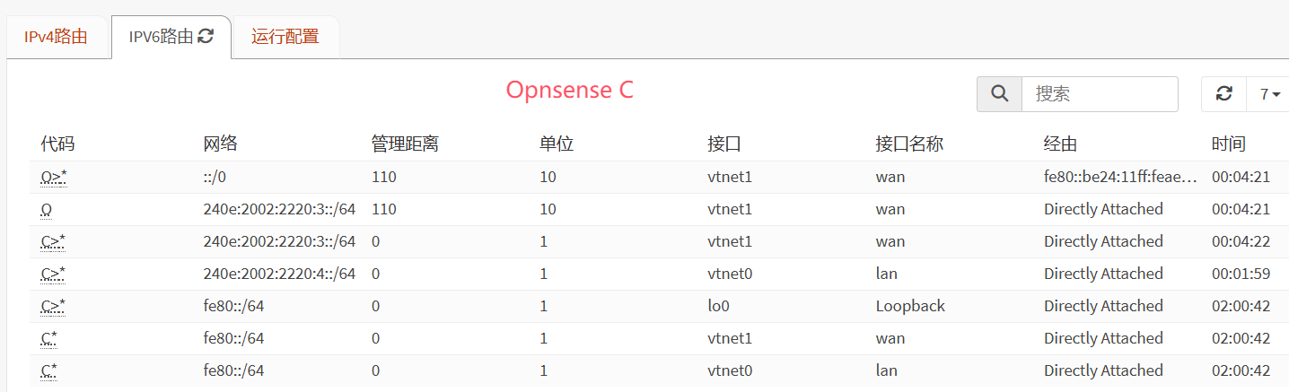 在Opnsense C 上配置WAN、LAN接口的v6地址 注意不要配置网关!否则OSPFv3无法建立邻居,原因未知。