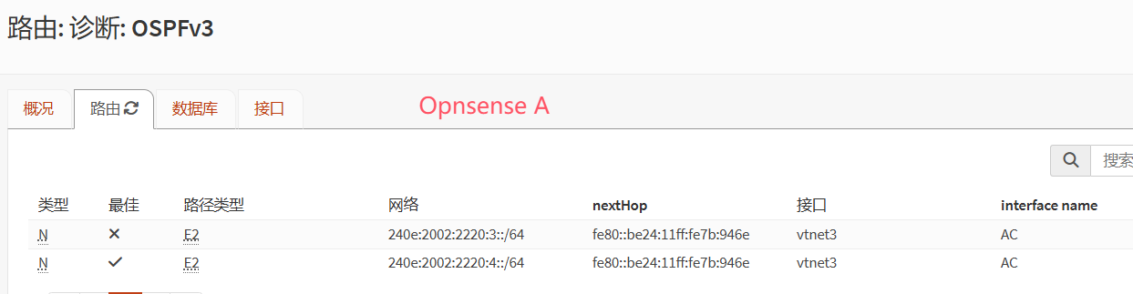 在Opnsense A 和 Opnsesne C 查看一下当前路由表,O表示通过OSPF到的路由。