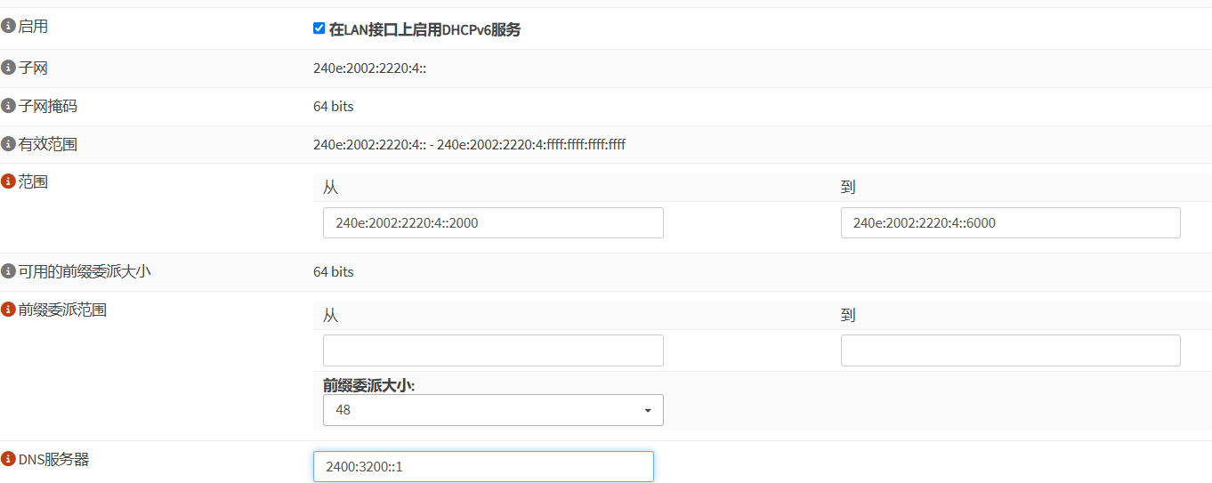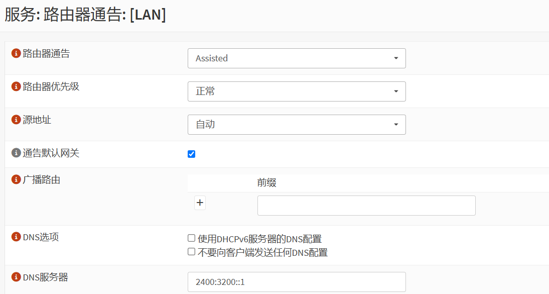开启LAN接口RA或DHCPv6 ,可以使用用RA通告DNS或者DHCPv6发布的DNS。两者选一或者都开启也可以。