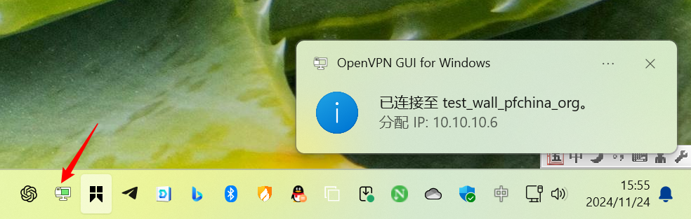 打开OpenVPN客户端,使用导入的配置文件进行连接。连接成功后,图标会变成绿色的带锁标记,同时会显示分配的隧道地址。
