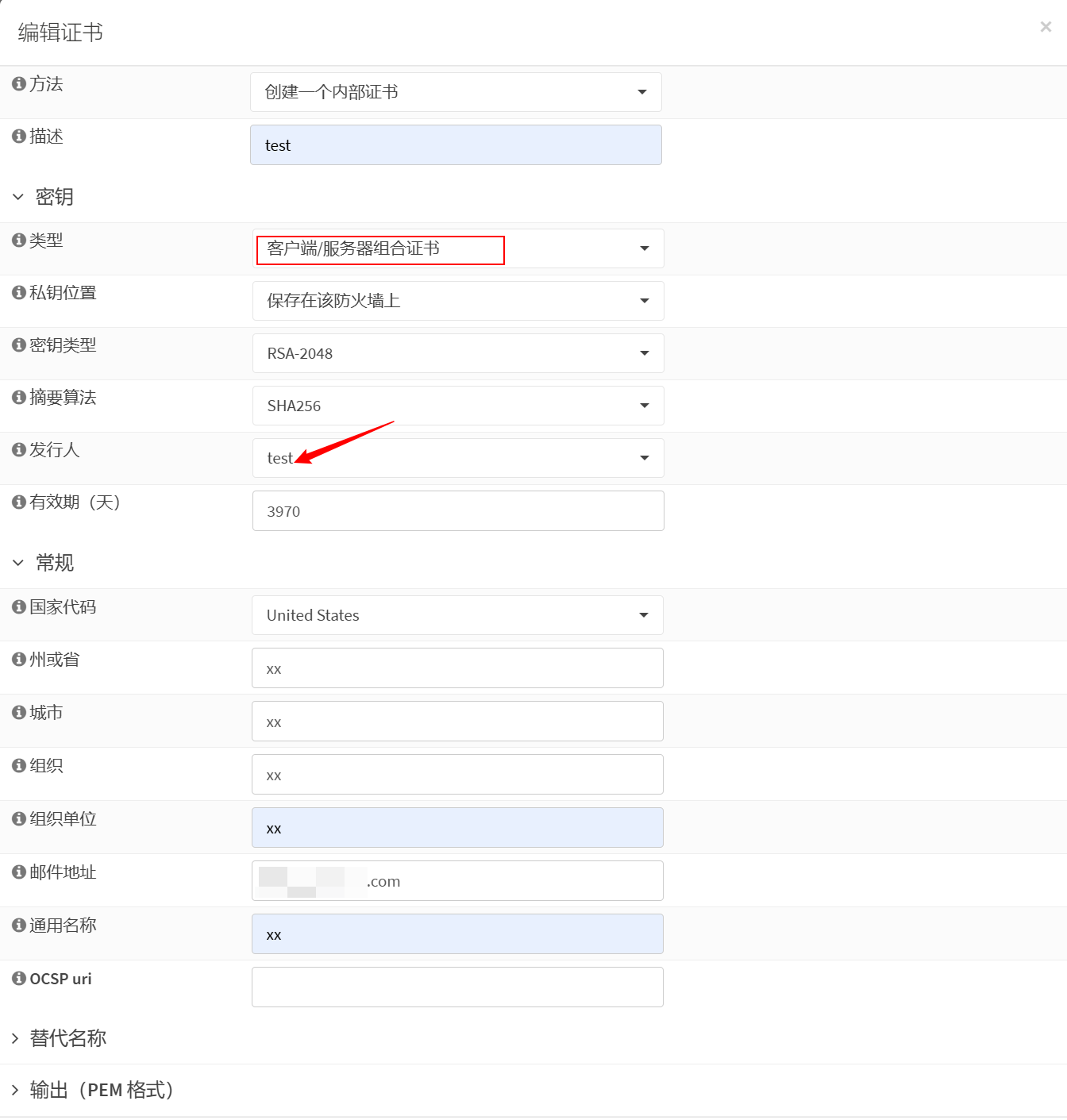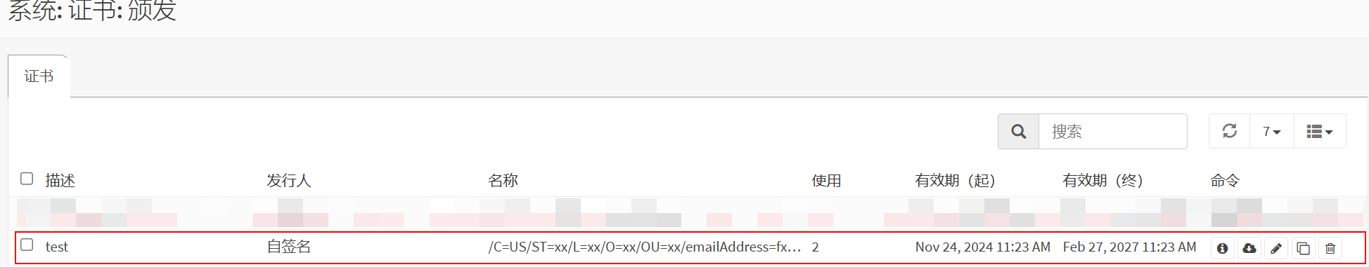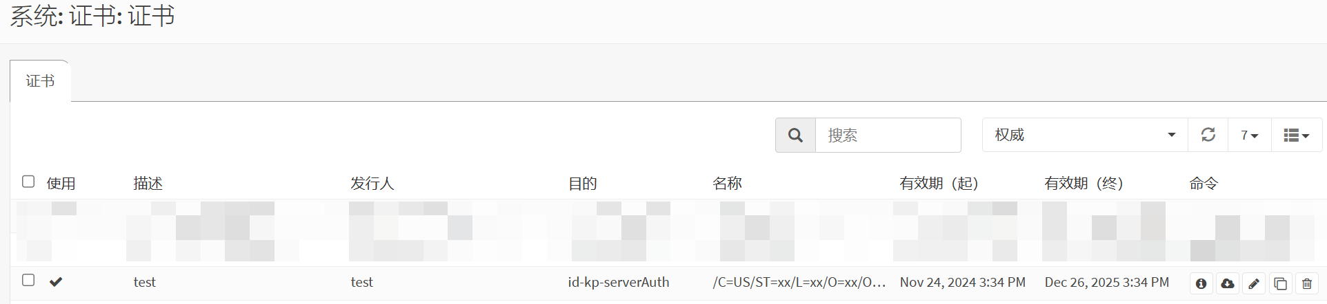 导航到 系统>证书 >证书,单击右下角添加,然后创建一个内部证书。输入描述名称如test,类型选客户端/服务器组合证书,发行人选前面添加的CA,密钥类型选RSA-2048,摘要算法选SHA256,其他字段根据需要输入 。