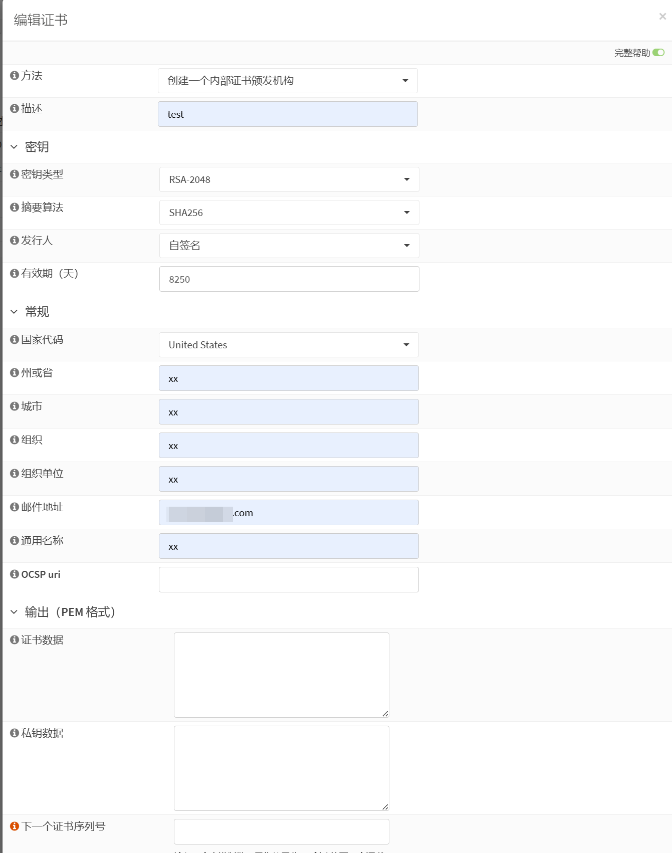 点击保存后,会出现证书编辑页面,根据提示输入用户证书的各项参数并保存。