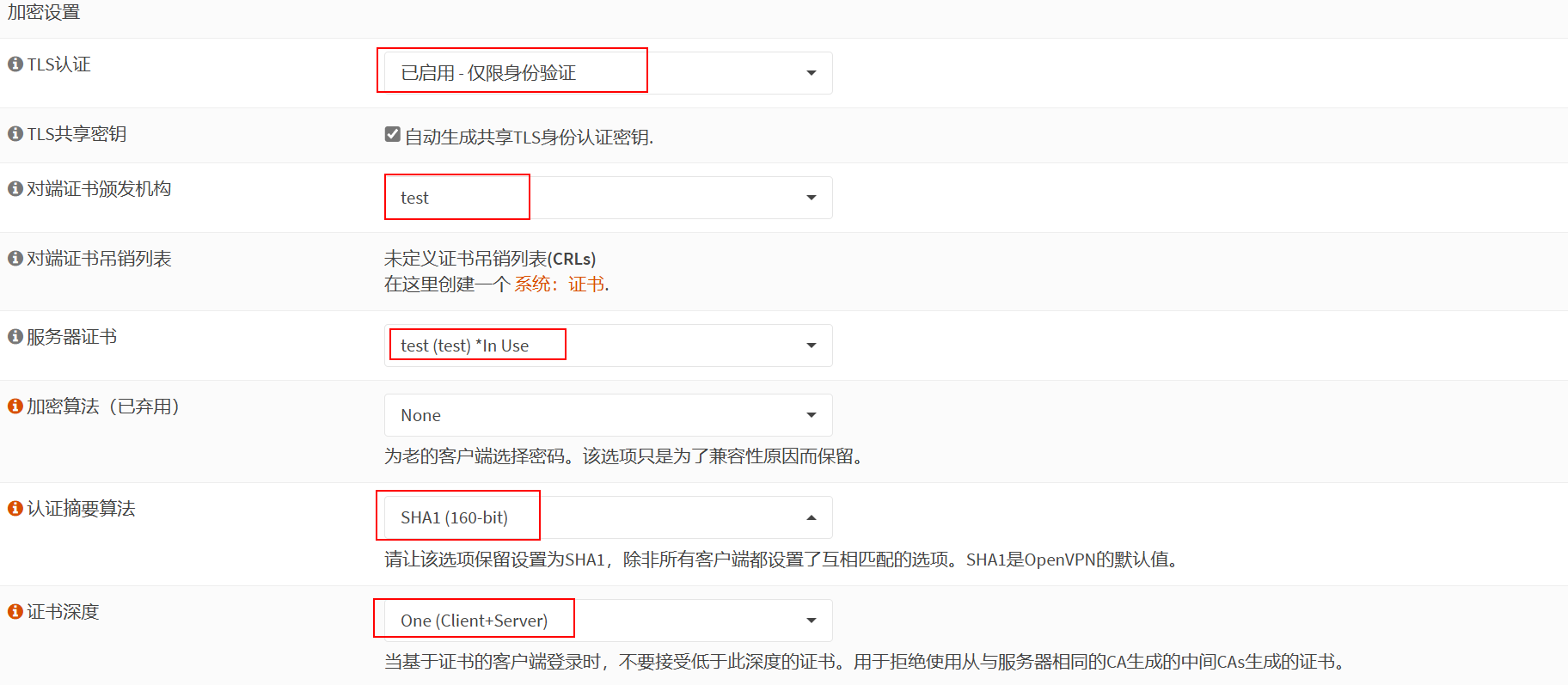加密设置:TLS认证选已启用-仅限身份验证,证书颁发机构和证书选中前面创建的CA和证书,摘要算法选SHA1,证书深度选One。