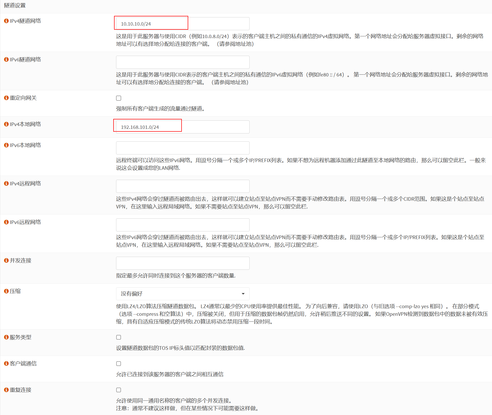 隧道设置:输入隧道使用的网络。注意不要与防火墙上任何已使用的网络相同,本地网络输入防火墙上希望被远程访问的内部网络。
