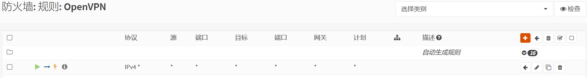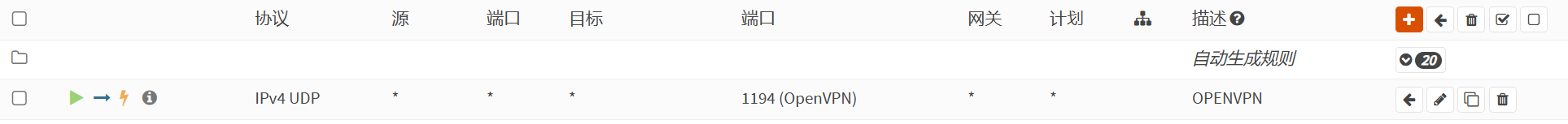 添加允许OpenVPN流量访问的规则:导航到 防火墙 >规则,OpenVPN选项卡,添加一条any to any规则,可以根据需要细化规则设置。