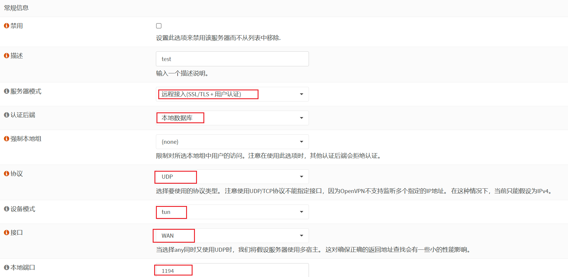 基本设置:服务器模式选择远程接入 (SSL/TLS+用户认证),认证后端口选本地数据库,协议选择UDP,设备模式选择tun模式,接口选WAN,监听端口使用默认的1194端口。