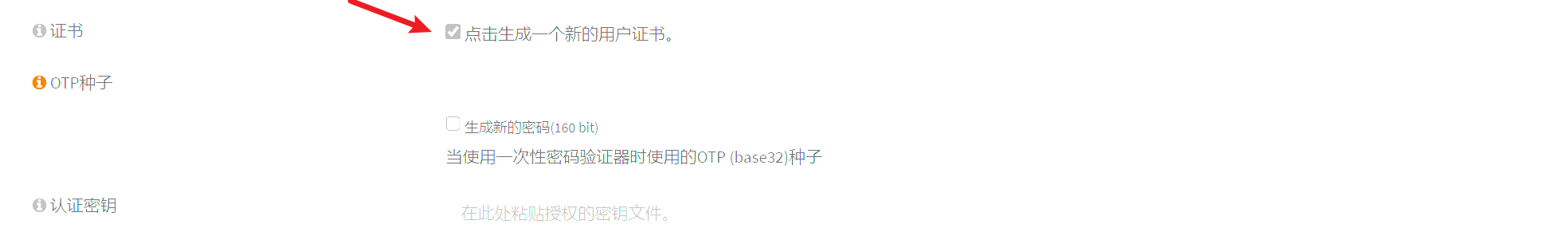 其他选项保持默认。找到证书项,选中生成一个新的用户证书。