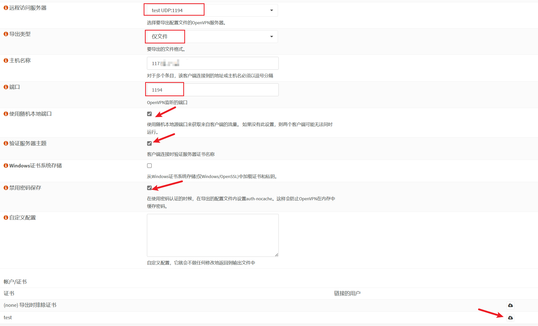 导出客户端配置文件:转到VPN > OpenVPN >客户端导出。在远程访问服务器中,选中刚刚创建的服务器,导出类型选中仅导出文件,选中如下图所示的其他选项。单击最下方的下载按钮,导出ovpn配置文件。